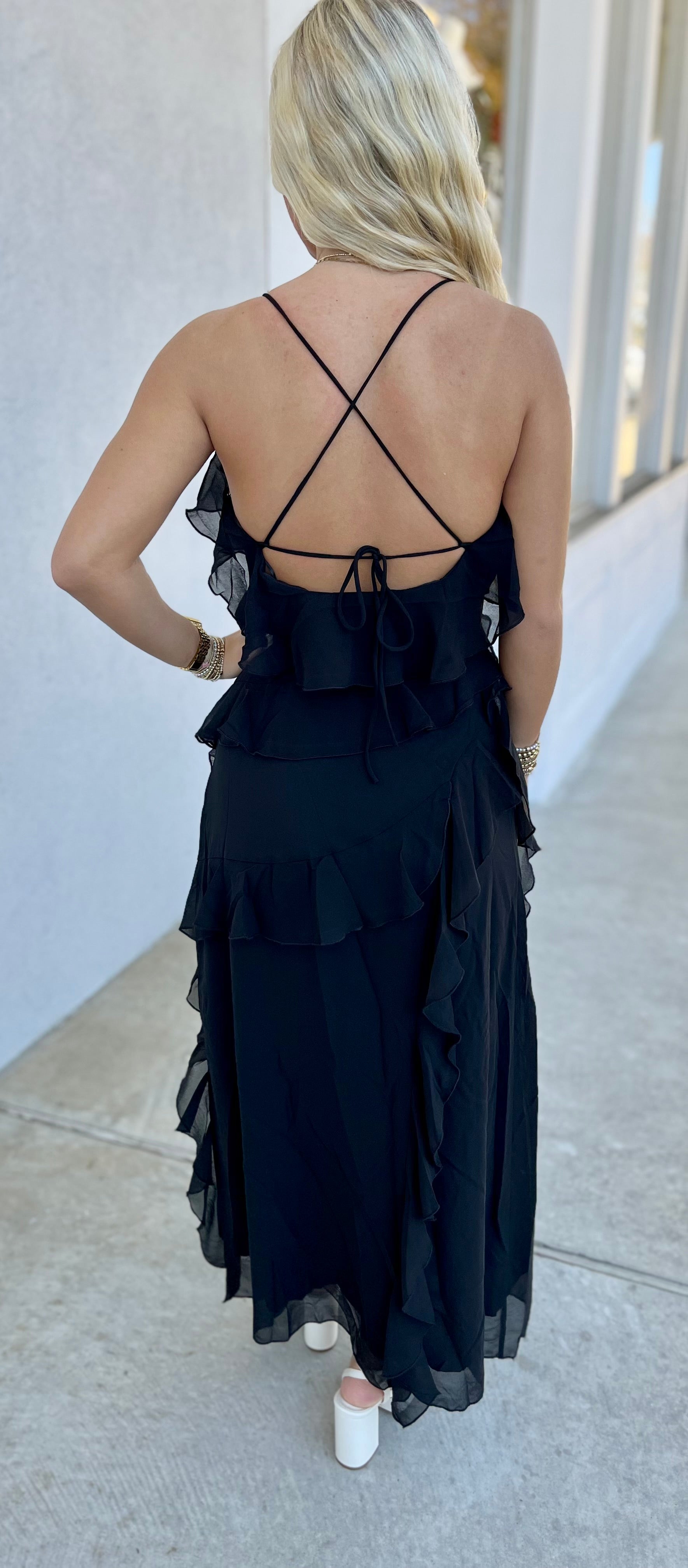 Black Layered Ruffle Detail Midi Dress