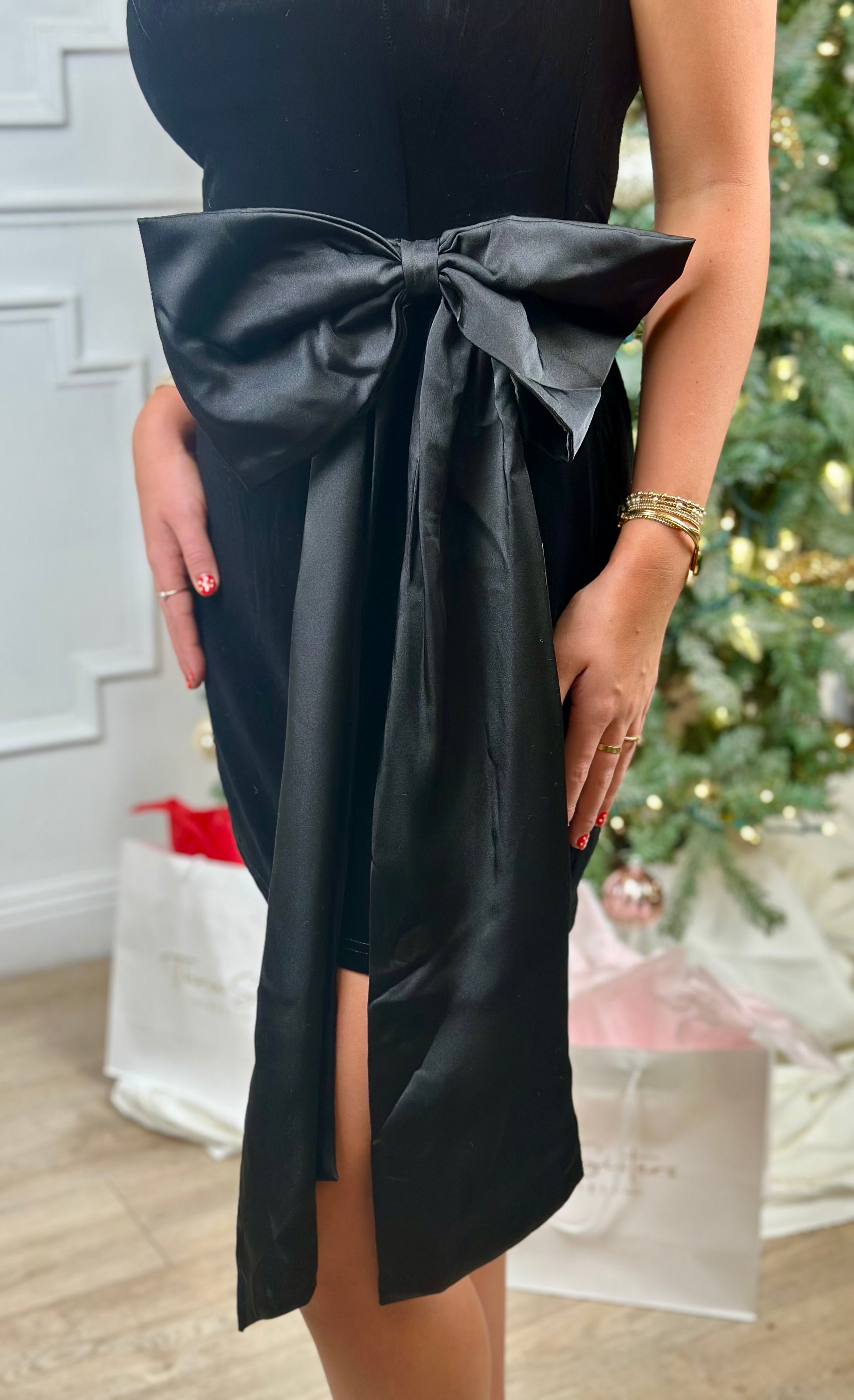Black Velvet Oversized Bow Strapless Dress