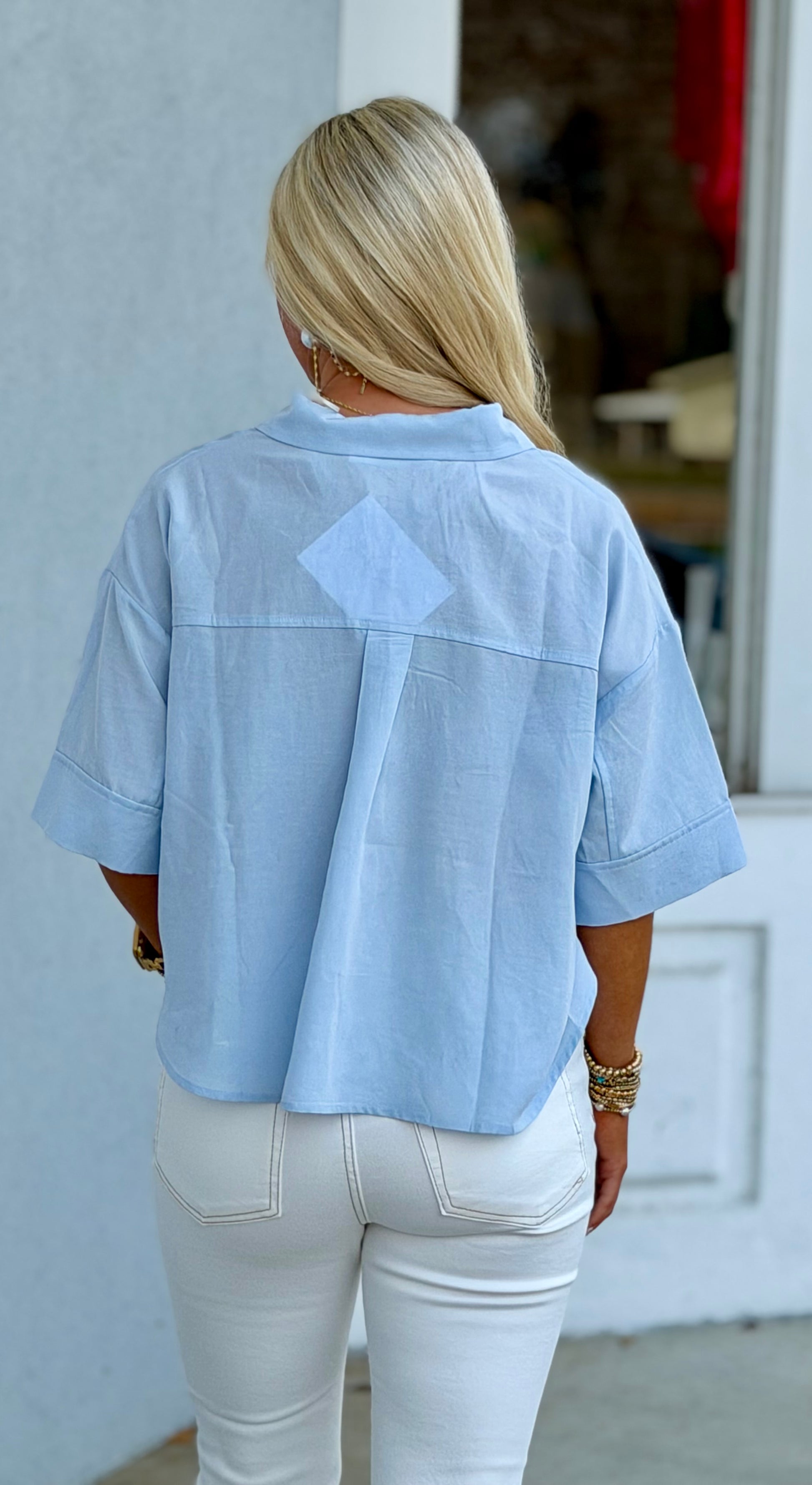 Collared Cropped Button Down Top, Ice Blue