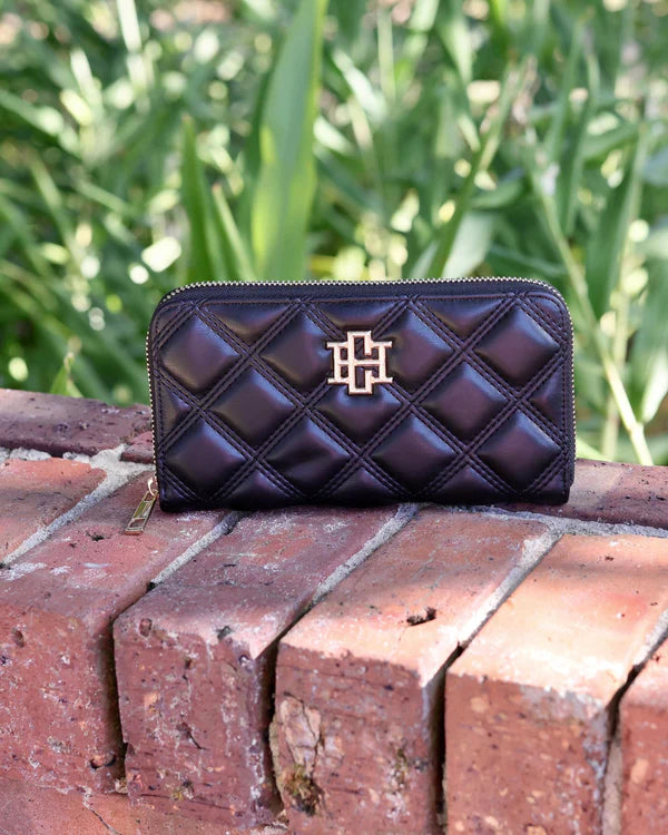 The Penelope Wallet in Black DQ features an elongated zip design with a central zippered coin pouch and two sets of card holders for organized storage. An outside slit pocket offers quick-access space, making it a stylish and practical accessory that holds all your daily essentials effortlessly.