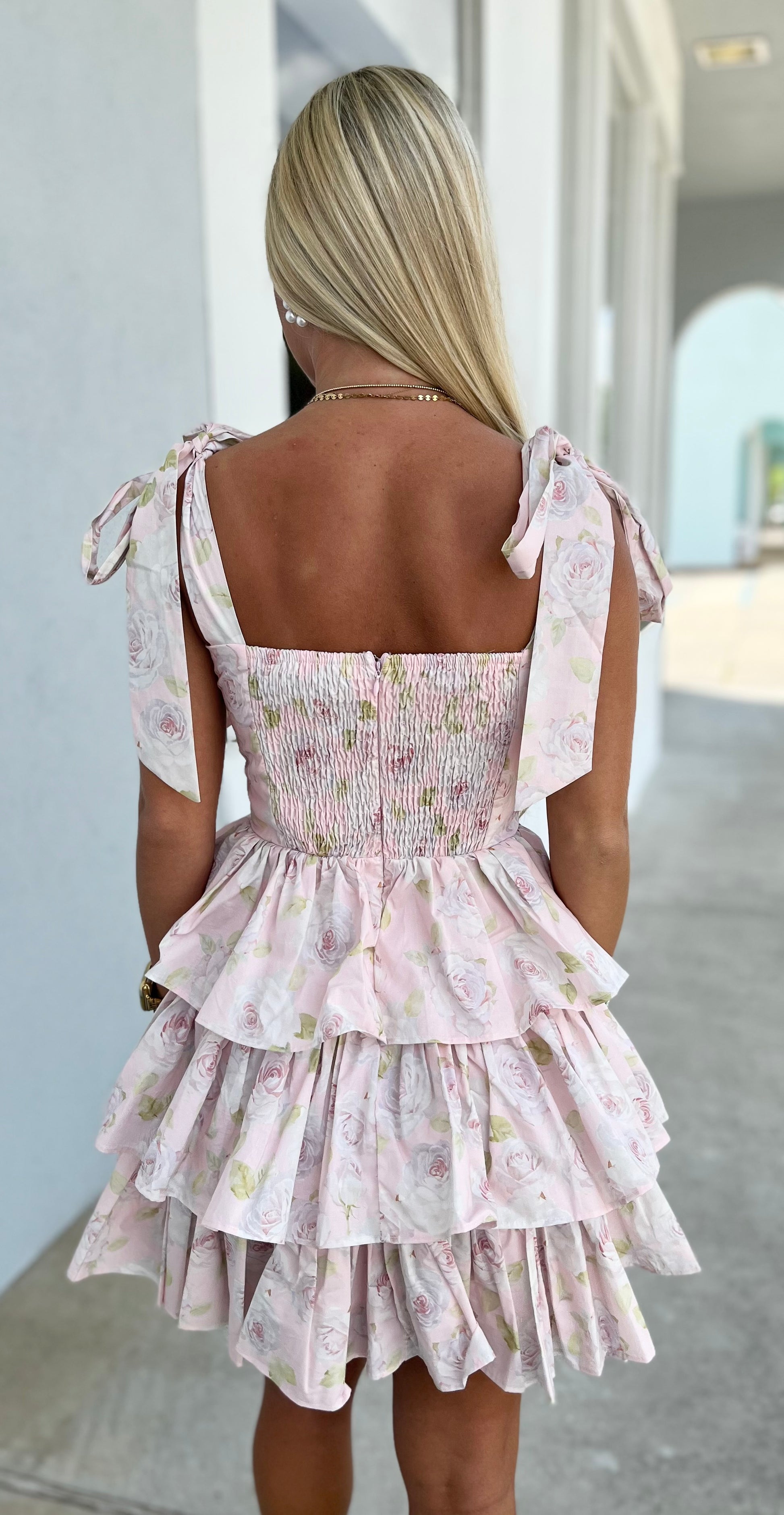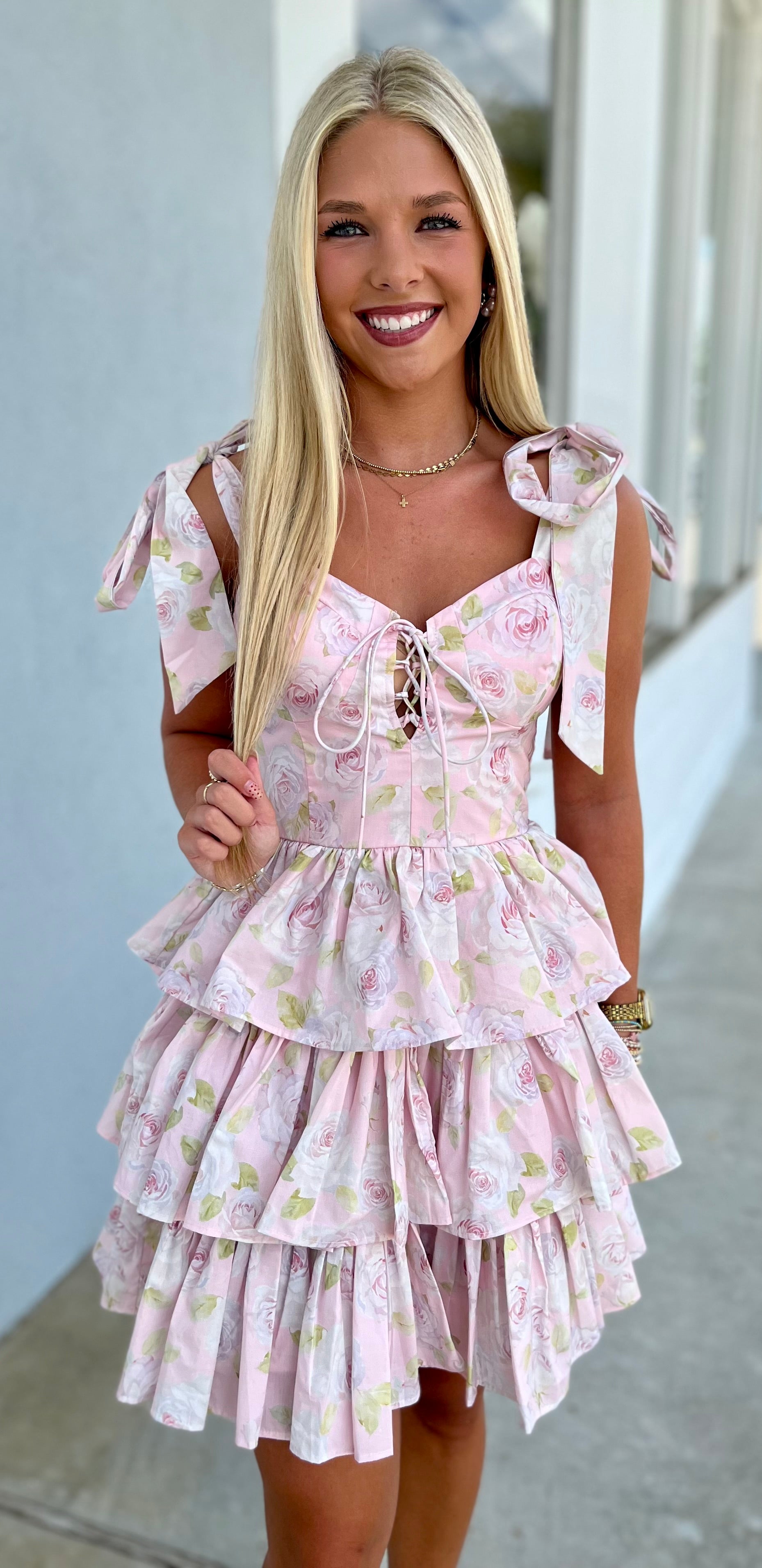 Pink Floral Shoulder Tie Corset Tiered Mini Dress