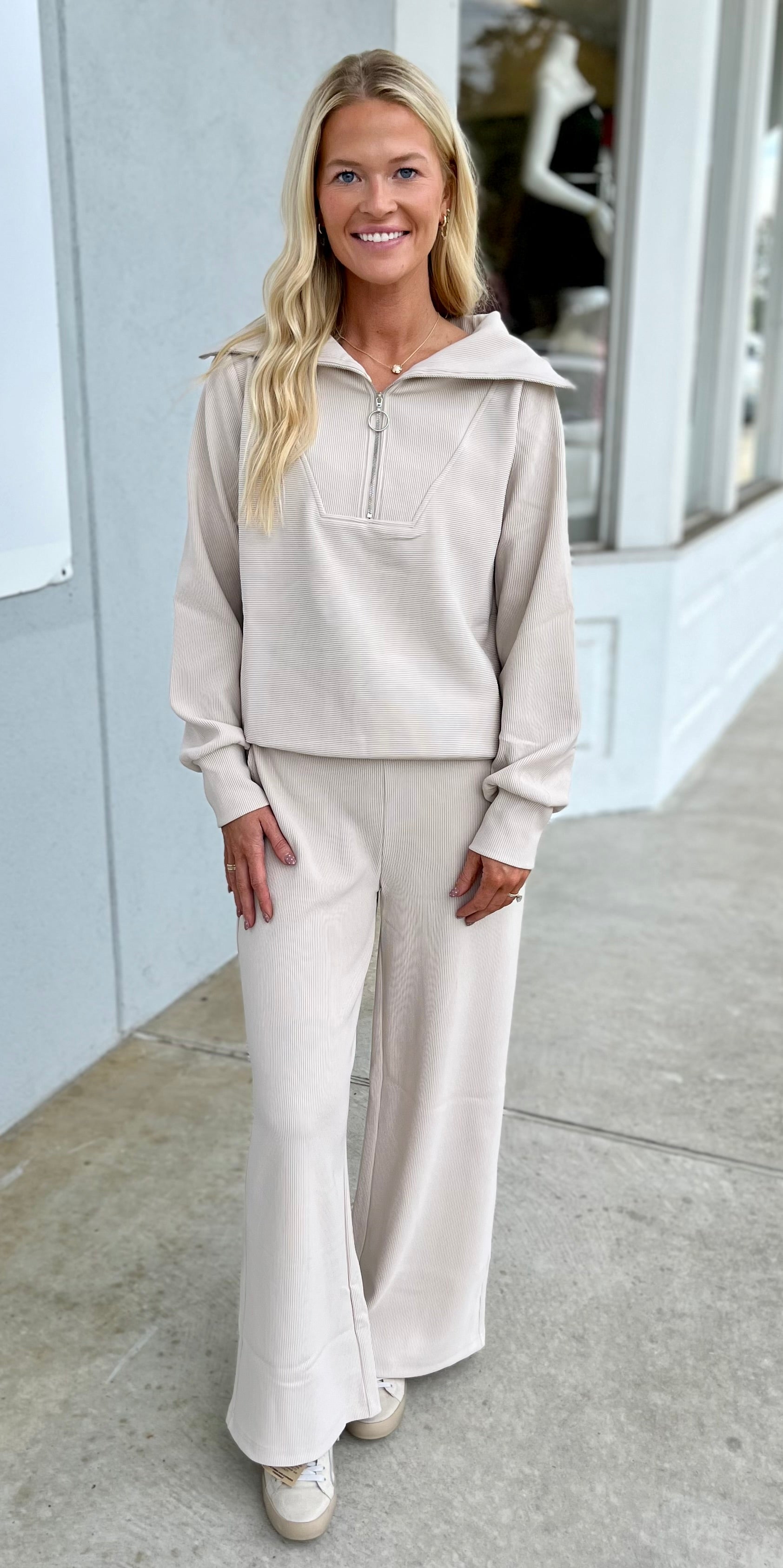 Ribbed High Neck Half Zip Top & Pants SET, Sand Beige