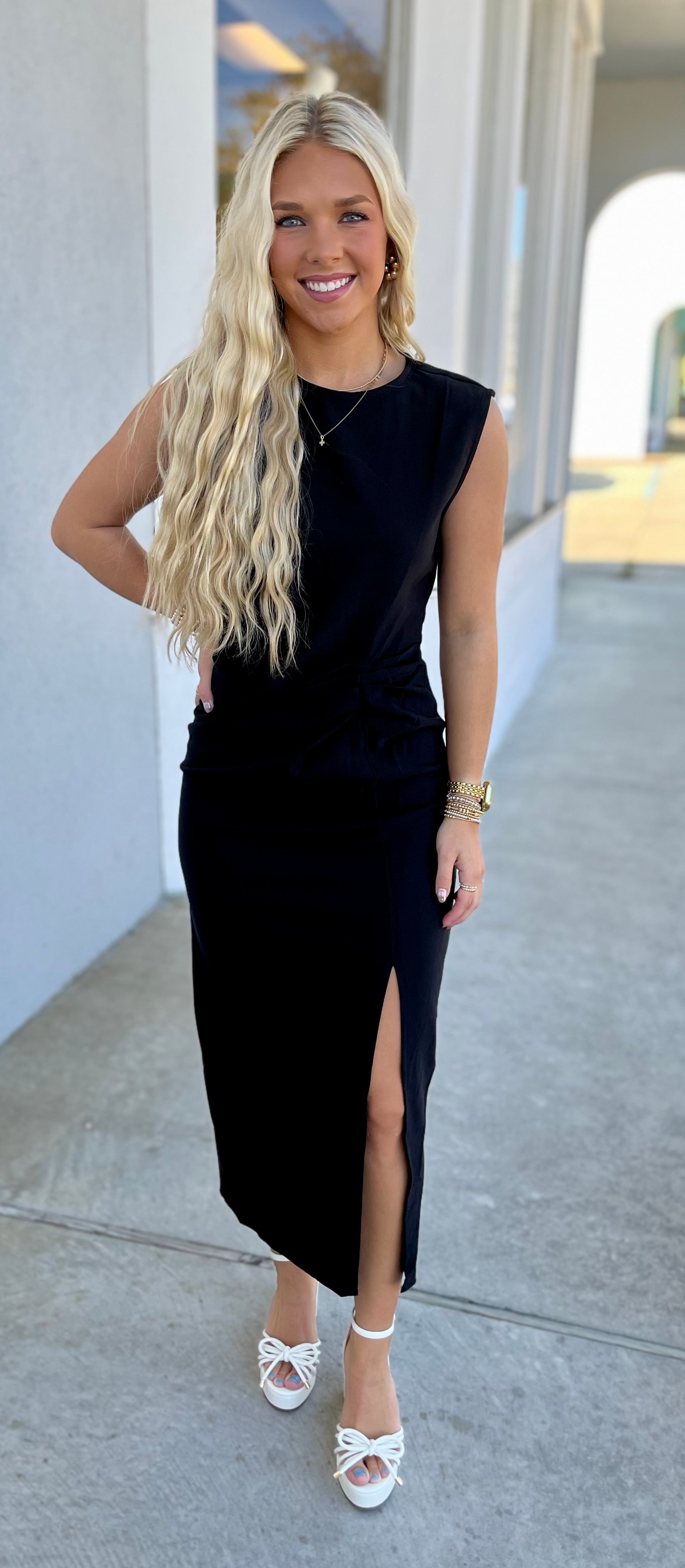 Round Neck Waist Pleated Slit Midi Dress, Black