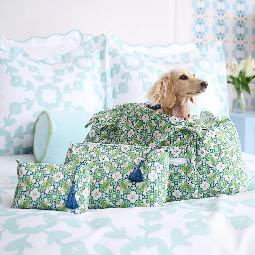 A fresh take on a travel essential. These cosmetic bags are your new go-to beauty bag. Lined with a plastic interior to make minor spills no big deal. -Fabric: 100% Cotton -Plastic lined interior -Zipper includes colored tassel -Small Size: 7" x 2.5" x 4"